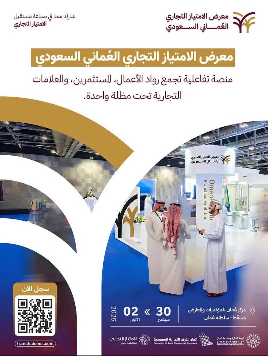 أعلنت غرفة تجارة وصناعة عُمان بالتعاون مع اتحاد الغرف السعودية عن تنظيم المعرض العُماني السعودي للامتياز التجاري، الذي سيُعقد في الفترة من 30 سبتمبر إلى 2 أكتوبر 2025 بمركز عُمان للمؤتمرات والمعارض في مسقط. ويُعد هذا الحدث محطة رئيسية لدعم العلاقات الاقتصادية بين البلدين، وجذب الاستثمارات في قطاع الامتياز التجاري الذي يشهد نموًا متسارعًا على مستوى المنطقة.